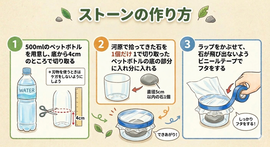 - 500mlペットボトル 4本 (底から高さ4cm程度で切り取り、ストーンの容器になります)