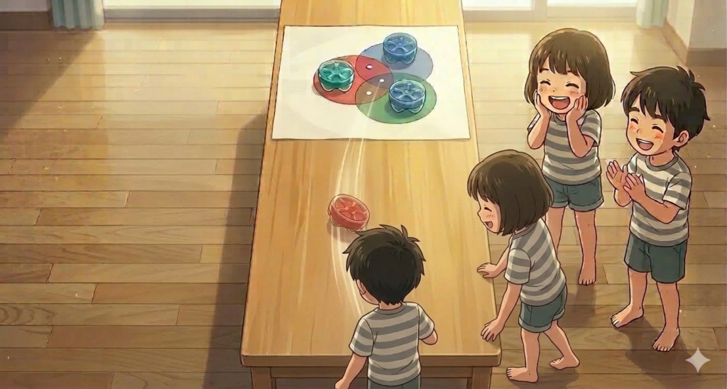 - ターゲット 直径17cmの円を3つ重ねた得点が書いてあるベン図(ターゲットは製作またはダウンロード後印刷し、ラミネートしておくと破れずに何回もつかえるよ)