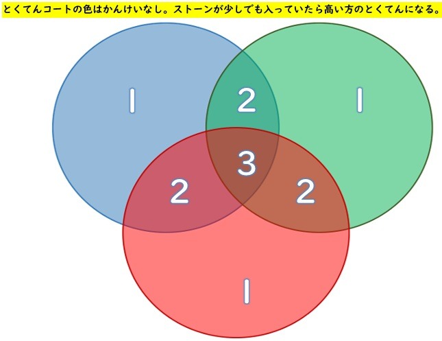 - ⑤4つ全部すべらせ終わった時に、ストーンがターゲット内または線上に少しでもかかっていたら得点となる。複数の線上にストーンがかかっている場合は点数の高い方が得点となる。